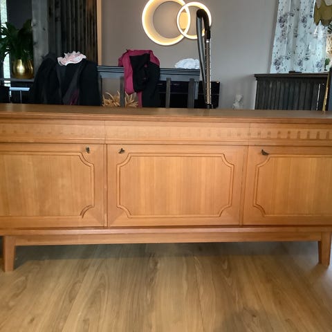 Praktisk sjenk med 4 skuffer til bestikk og 4 skap med hyller i teak. Elegant linjeføring og design fra 50 tallet.
