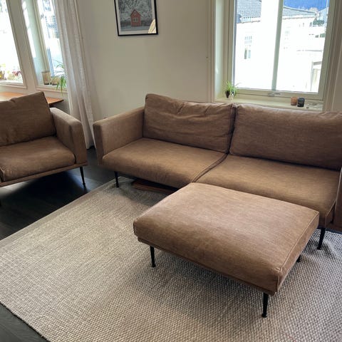 Passer som sittegruppe i stue eller TV-stue, og puffen kan brukes som ekstra sitteplass eller som fotskammel. Mål står på hvert bilde.