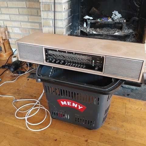 Forsterkeren fungerer og jeg har brukt den ofte de siste årene, men nå har jeg verken tid eller plass til den. Problemet er at jeg knuste et rør i en av mine andre forsterkere. Derfor måtte jeg ta et fra denne. Dette røret kan kjøpes på Finn og etter denne vil den være fullt fungerende.
