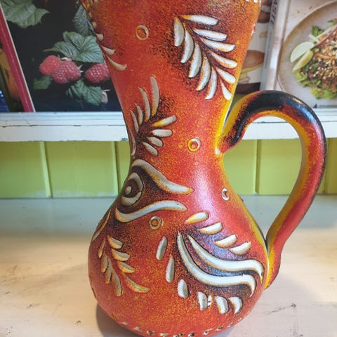 Liten vintage vase/blomstermugge i keramikk. Grå med blått mønster.