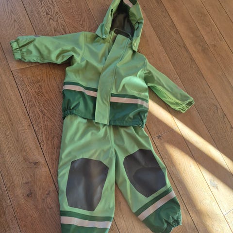 Regnjakke og regnbukse. Brukt av to barn. Slitasje i farger og knapper. Strikken til å feste u der skoene må byttes. Mye bruk igjen.