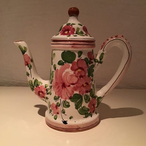 Christineholm Design Studio tekanne og koppesett i gult porselen med håndmalt blomstermønster i grønt og rødt. Settet består av tekanne med lokk, fire kopper og tilhørende fat i samme dekor. Passer til servering av te eller kaffe. Alle deler har samme gule farge og motiv med blader og blomst, og er merket Christineholm Design Studio under.