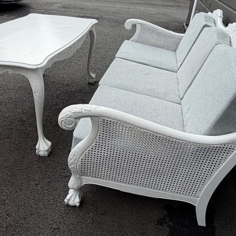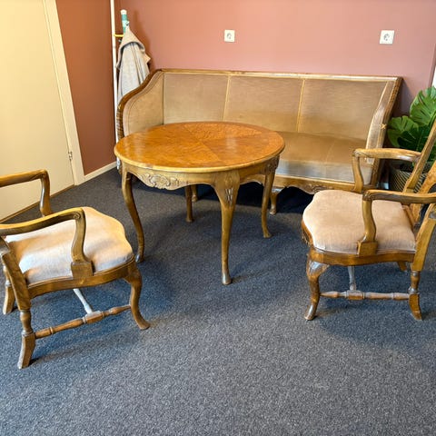 Salongmøbler klassisk salongsett sofa lenestol bord krakk tekstil og tre
