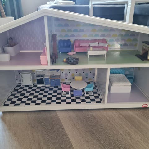 Selger dukkehus med ekstra etasje, dukker og utstyr. Det meste er i god stand, men det er noe bruksmerker på dukkehuset (tak og gulv) se bilder. Lys fungerer.