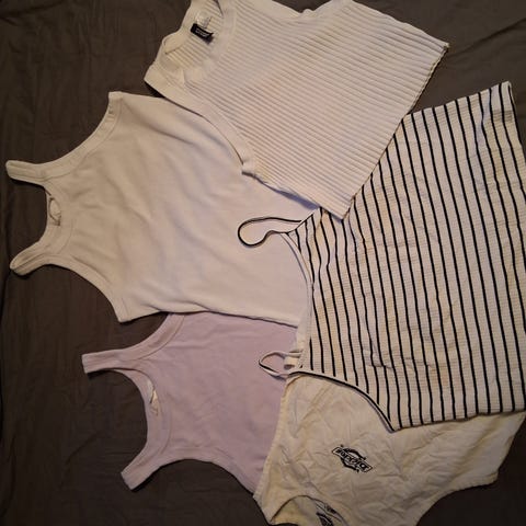 3 tanktopp. To er XS og den ene XXS. Den grå er fra aliexpress.