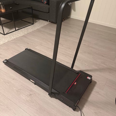 Xymor tredemølle med integrert konsoll og håndtakskontroller for start, stopp og hastighet. Tredemøllen har løpebånd med sidekanter og frontpanel med display for visning av treningsdata. Egnet for innendørs kondisjonstrening og gange eller lett løping. Strømtilkobling via kabel på siden av rammen. Passer til hjemmebruk der man ønsker enkel justering av hastighet direkte fra håndtakene.