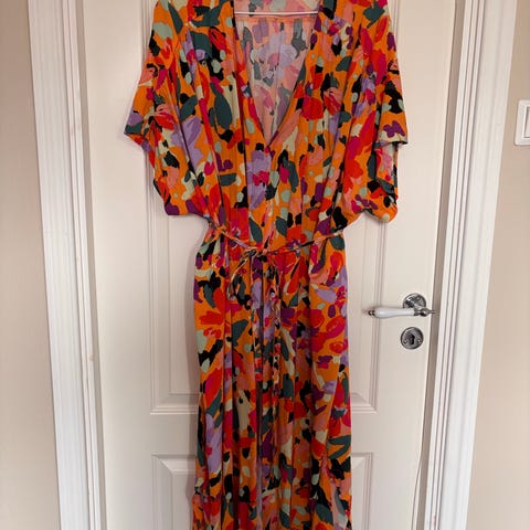 Den er ermeløst snitt, omslagslignende front med to knapper og knytebelte i livet. Lengden går omtrent til under kneet, og det er splitt i siden for bedre bevegelse.