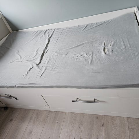Kjøpte den for to år siden. Bildet er ein kopi fra IKEA, fikk dessverre ikkje tatt bilde av senga før eg flytta på senga ut fra rommet som pusses opp. Den der ut som ny. Kjøper må se varen og godkjenne den.