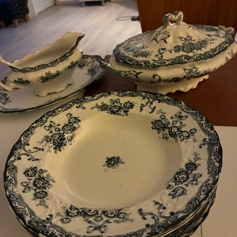 5 frokosttallerkener og 10 små middagstallerkener selges samlet.