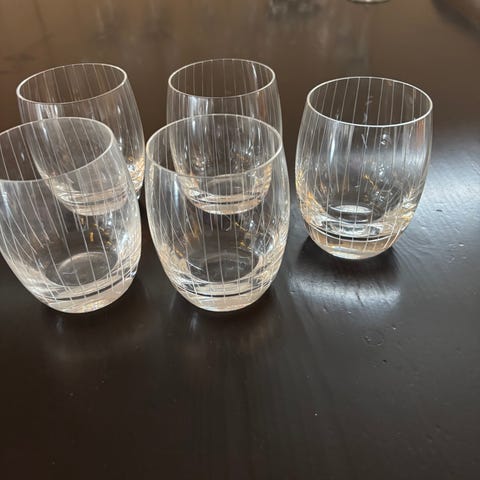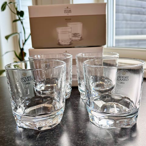 Holmegaard drikkeglass, i klart glass. Seks stykker. Glassene har avrundet form og er uten stett. Egner seg til vann, juice eller andre kalde drikker i hverdagsbruk eller til borddekking ved ulike anledninger. Merkevarelogo er preget i bunnen av glassene.
