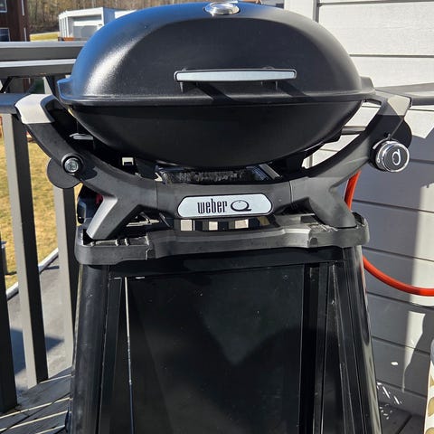 Weber Q gassgrill i svart utførelse. Grillen har lokk og bunn i støpt materiale med rist i metall. Den står på stativ med sidehåndtak og krok for oppheng av grillredskaper. Egnet til grilling av kjøtt, fisk, grønnsaker og annen mat utendørs på terrasse, balkong eller i hage. Brukes med gassflaske tilkoblet via slange og regulator (ikke synlig komplett utstyr på bildene).