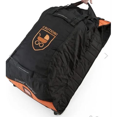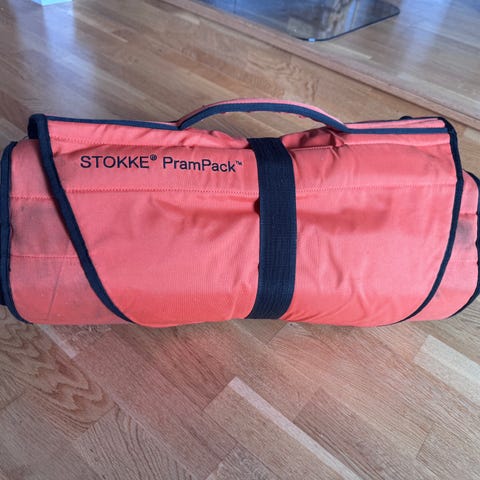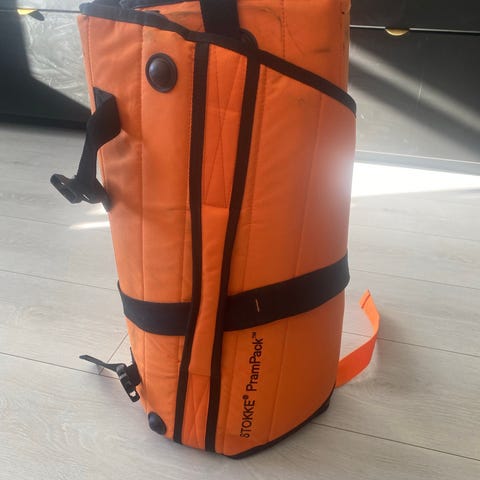 Stokke PramPack trillekoffert. Den kan rulles sammen for enklere oppbevaring når den ikke er i bruk, og har bærestropper og hjul for lettere håndtering. Innvendige stropper holder vognen på plass. Det er et slitasjepunkt som anvist på et av bildene. Det er også plass til annet ustyr, som bilstol m/base, sammenslått høystol etc..