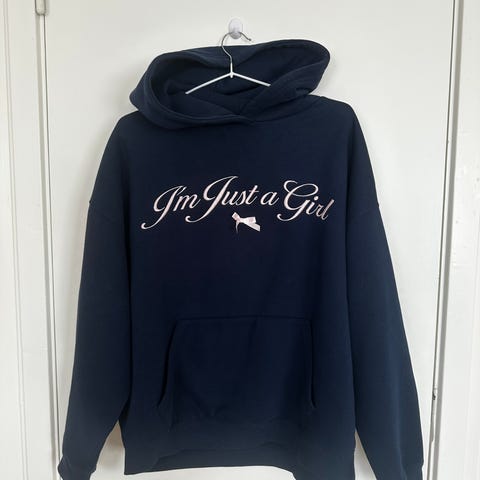 Genseren har hette med snøring og ribbestrikkede kanter nederst og på ermene.