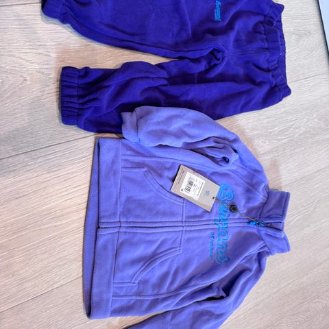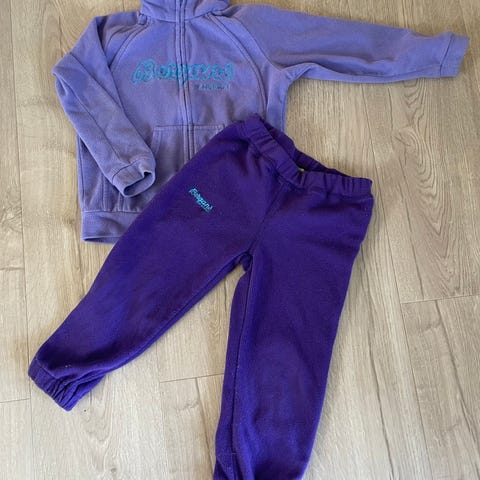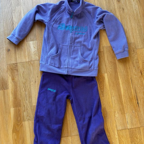 Lilla fleecesett fra Bergens. Pent brukt, men lappen bak har løsnet på det ene festet på både jakken og buksen.