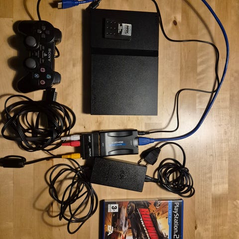 PS2 slim selges. Testet og fungerer slik den skal. Følger med strøm og video kabel, en kontroll og minnekort.