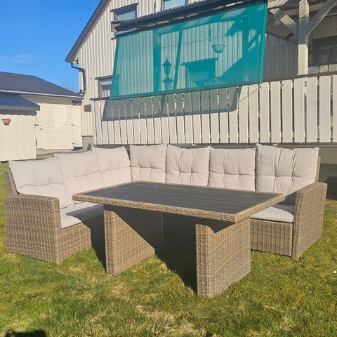 Eksklusive ,flott og romslig vinkelsofagruppe med herlig sittekomfort. Den brede fletten gjør gruppen unik. Sofaen er vendbar.Er produsert i polyetylen kunstrotting og er UV-beskyttetRammene er i pulverlakkert aluminium. Bordplate i herdet glass.