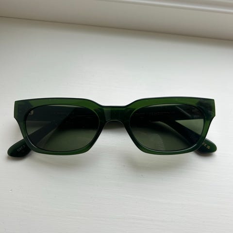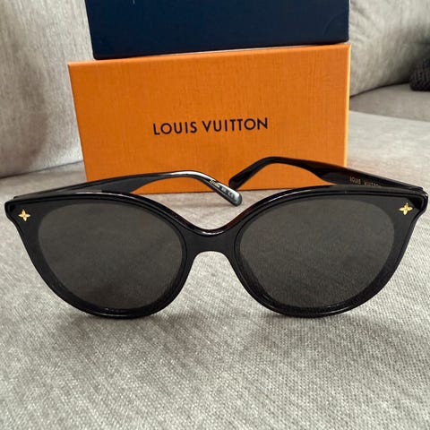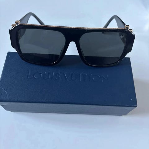 Louis Vuitton solbriller for unisex med markert, rektangulær innfatning. Rammen har grønn marmoreffekt med mørke glass. Solbrillene har tydelige metall- og logodetaljer på sidene. Passer til både hverdag og bruk i sterk sol. Leveres med originaltui fra Louis Vuitton, slik det fremgår av bildene.