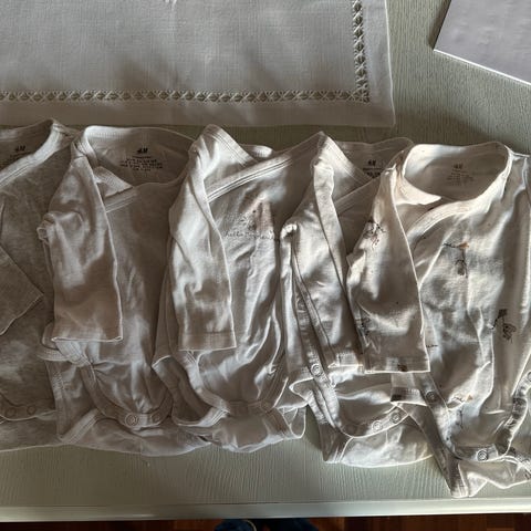 En pakke med ulike bodyer i ulik str. Alt fra str. 50 til str.68.