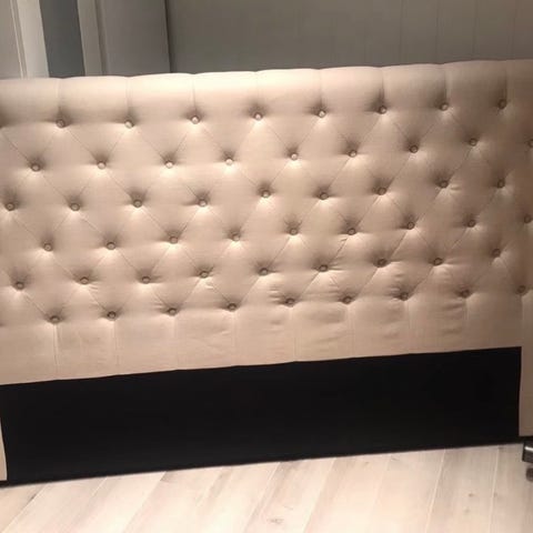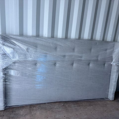 Sengegavl i grå tekstil. Sengegavlen har trukket front med knappestikking og glatt bakside. Passer som ryggstøtte bak seng og kan brukes sammen med ulike sengetyper der målene stemmer. Materialet fremstår som tekstiltrekk over polstret kjerne for økt komfort ved sitting i sengen.