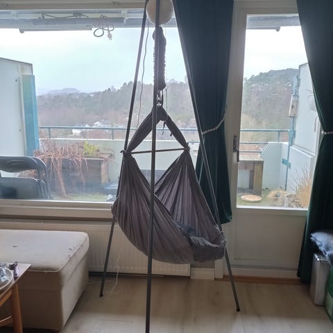 Uro som er knytt på kan følge med hvis ønskelig. Vuggen har vært en livredder her i huset og håper at noen andre også kan få glede av den.