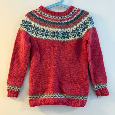 Ullgenser til jente i størrelse 110. Genseren er rød med hvitt hjertemønster rundt bærestykket. Strikket i ull, med lange ermer og rund hals. Passer til hverdagsbruk og som varm mellomlag på kjølige dager.