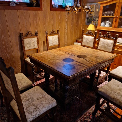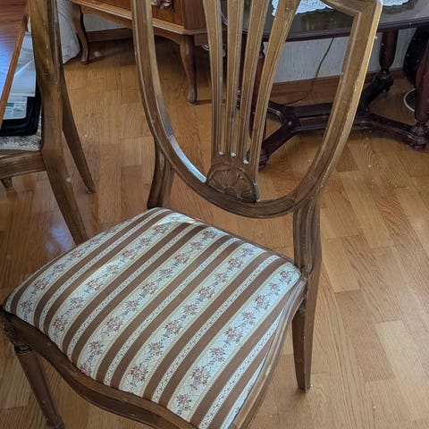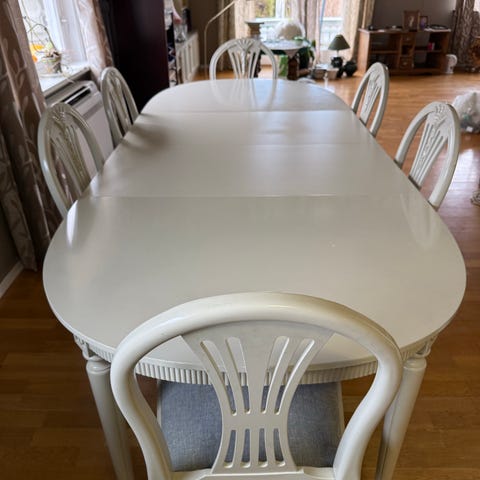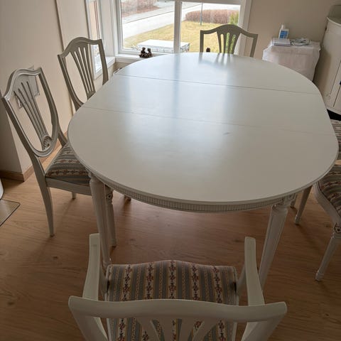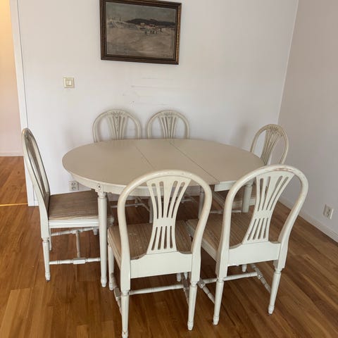 6 stoler og spisebord i Gustaviansk stil vurderes solgt. Er noe brukt slitasjer men velfungerende bord og stoler.