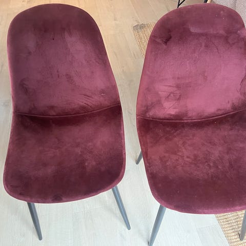 Selger to fine velur stoler fra nordic furniture group. Disse er brukt men ikke mange synlige bruksmerker. Veldig behagelige stoler som skiller seg veldig ut på grunn av den nydelige fargen.