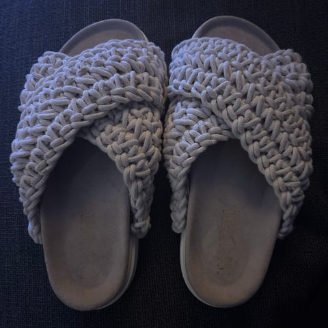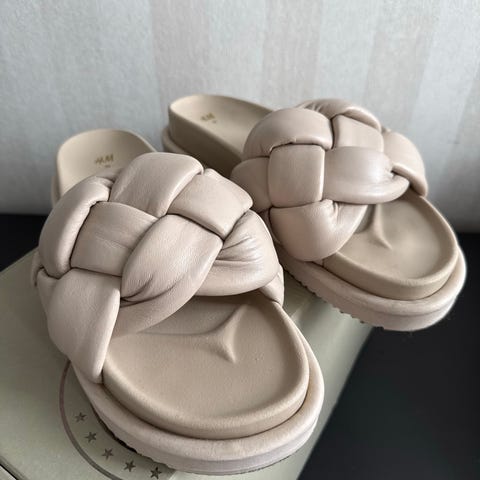 INUIKII sandaler i størrelse 37. Modellen er en slip-in sandal med hvit såle og bred, heklet offwhite rem over foten. Remmen har en dekorativ kjededetalj i plast i kontrastfarge. Sandalene har flat såle med lett platå og åpen tå.