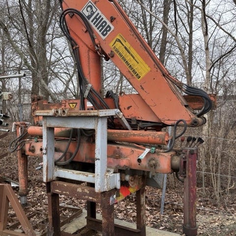 Hydraulisk lastekran for montering i varebil. Kranen er laget i stål og er hovedsakelig grå med oransje hydraulikksylinder og betjeningsarm. Den er festet til gulvet og siden i bilen, og er egnet for løfting og håndtering av tungt gods inn og ut av varerommet. Konstruksjonen inkluderer vertikal søyle, svingarm og fotplate for stabilitet. Passer for bruk i varebil eller tilsvarende kjøretøy der det er behov for enkel intern lasting og lossing.