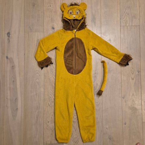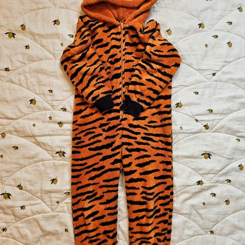 H&M heldrakt - tiger, for barn i størrelse 110/116. Drakten er i polyester og har et flerfarget tigermønster med hette som har dyreansikt og ører. Egnet som kosedress eller utkledning for barn i aktuell størrelse.