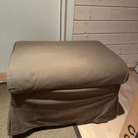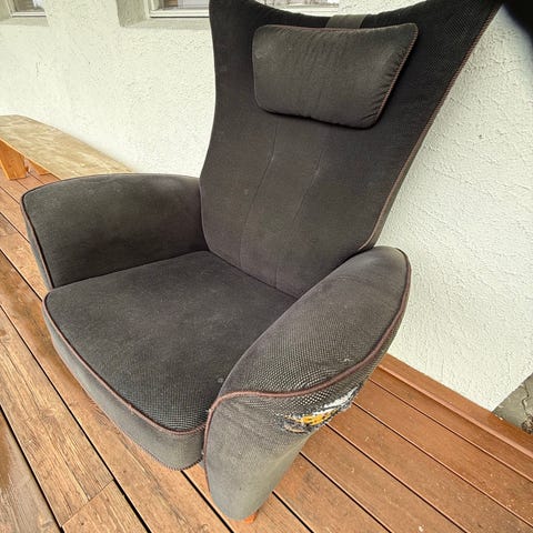Jeg gir bort en komfortabel stol med store behagelige puter. Begge putene har avtagbare trekk. Stolen er sort med semsket/microfiber stoff som er lett å holde ren. Trenger en vask.