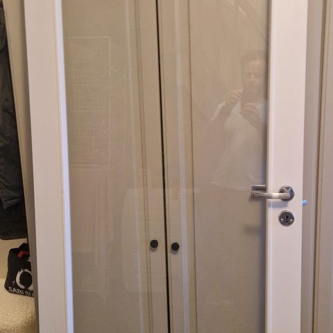 Pga leveringsproblemer med Swedoor har vi måttet skifte våre innerdører til annet merke. Selger derfor denne fine glassdøren med karm. Fin svart eikefiner, herdet glass. Nypris ca 12000.