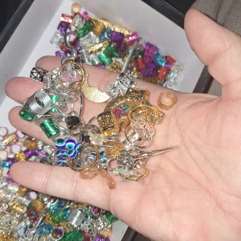 Er vel en del piercing til det meste. Ikke sølv, men nikkel fritt. Noen er i plast, lyser nok i neonlys. ( antall mellom 250- 350 stykker ca, orker ikke å telle.)