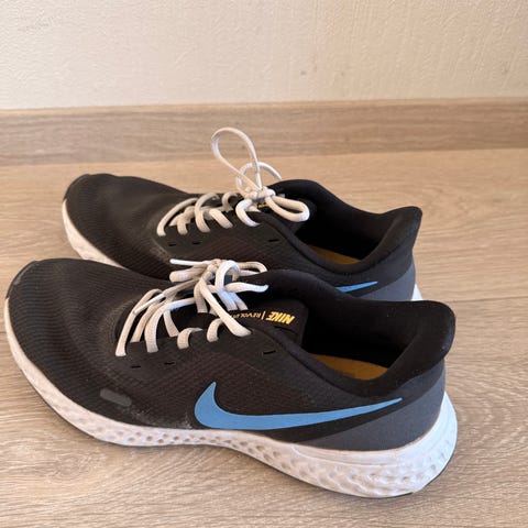 Nike joggesko i størrelse 48. Modellen er i mørk blå farge med hvit såle og hvit Nike-logo på sidene. Overdelen ser ut til å være i pustende tekstilmateriale med snøring foran. Yttersålen har mønster som gir grep på underlaget. Skoene passer til hverdagsbruk og lett trening som gåturer og jogging.