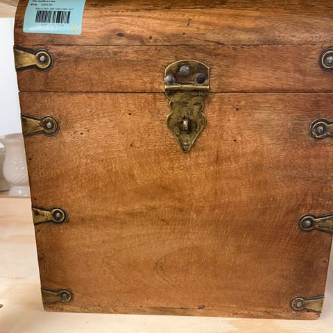 Selger et unikt og dekorativt treskrin i antikk stil med flotte detaljer og solid utførelse. Skrinet har et klassisk “kiste”-design med buet lokk, metallbeslag og dekorative nagler som gir et autentisk vintage preg.