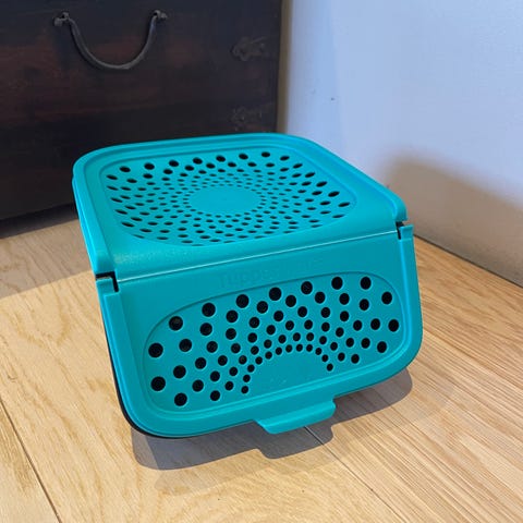 Tupperware oppbevaringsboks i plast med turkis lokk. Boksen har perforert lokk og side for ventilasjon, egnet til oppbevaring av matvarer som trenger lufting, for eksempel frukt og grønnsaker. Laget i solid plast som kan brukes flere ganger og er enkel å rengjøre. Passer til bruk på kjøkkenbenk, i kjøleskap eller i skap for organisert oppbevaring.Jeg kan sende med Post Nord porto blir 69kr.