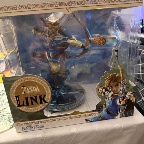 First 4 Figures The Legend of Zelda: Breath of the Wild Link on Horseback samlefigur. Figuren viser Link ridende på hest på en detaljert sokkel. Modellen er laget som en statisk figur med fargelagte detaljer i klær, utstyr og hest. Leveres i original eske med formstøpt innmat for trygg oppbevaring og transport. Egner seg som samlerobjekt eller utstillingsfigur for fans av The Legend of Zelda-serien.