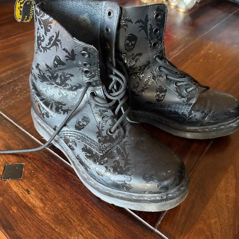 Dr. Martens støvler i størrelse 39. Klassiske snørestøvler i svart med karakteristisk gul søm rundt sålen. Lite brukt, og i god stand.