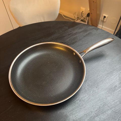 Tefal stekepanne i grønn farge med non-stick belegg. Pannen har håndtak i plast og bunn i metall med punktert mønster for jevn varmefordeling. Egnet til daglig matlaging av for eksempel steking av kjøtt, fisk, grønnsaker og pannekaker. Kan brukes på vanlige komfyrtopper; kompatibilitet med induksjon avhenger av modell og bør eventuelt sjekkes mot merking på pannen.