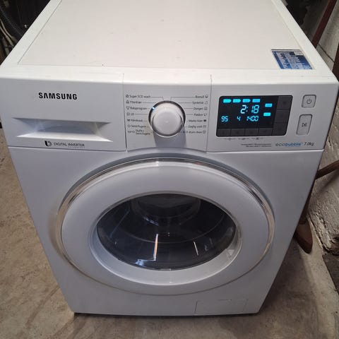 Samsung vaskmaskin i hvit farge. Lager broker litt, men den er i god stand.