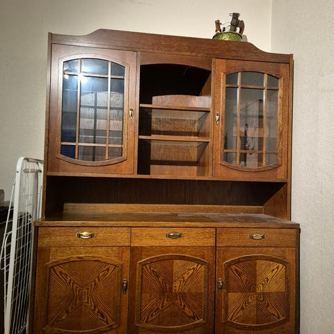 Brun skjenk / seksjon / vitrineskap selges. Den er tredelt, i tillegg til at overdel kan tas av, så enkel å flytte (se siste bilde der den er demontert).