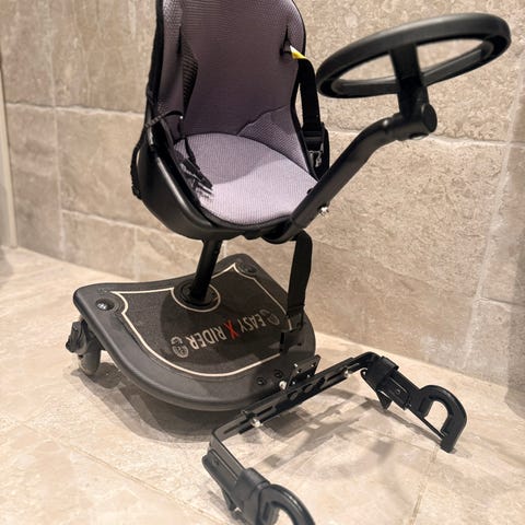 Baby Jogger ståbrett til barnevogn. Ståbrettet festes bak på vognen med integrerte fester og har to hjul for stabilitet.