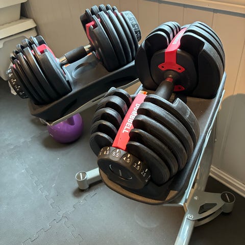 2 stykk justerbare hantler av merket bodymax, selective dumbbell, kan justeres fra 5-32,5 kg, ikke de nyeste men fungerer som de skal. Aldri sluppet i gulvet. Selges 2500kr