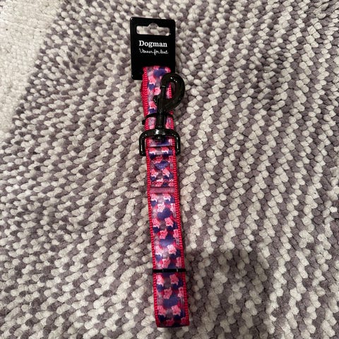 Hunde halsbånd i rosa med metallspenne og ring for feste av bånd. Halsbåndet har dekorativ LOVE-tekst i metall. Egnet til større hund, med justerbar lengde for tilpasning rundt halsen. Materialet fremstår som imitert skinn med søm langs kantene for ekstra holdbarhet.