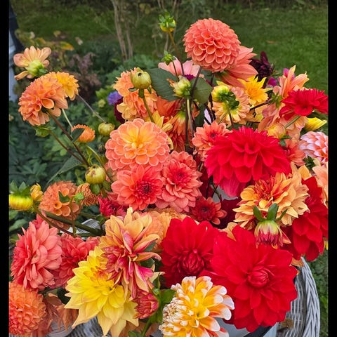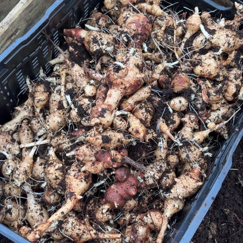 Står til fordriving nå. Usikker på farge, men har flest burgunderrøde. Flere knoller i en pose med jord. 100,- per pose.