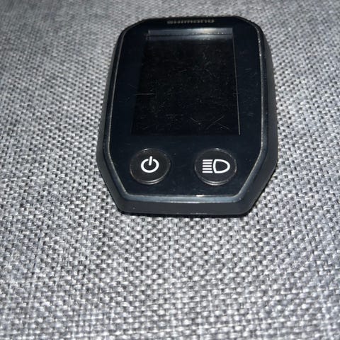 Shimano sykkelcomputer i svart farge. Enheten har skjerm og betjeningsknapper på forsiden. Beregnet for bruk på elsykkel for visning av informasjon under sykling, for eksempel hastighet, distanse og andre relevante data avhengig av kompatibelt system og oppsett.