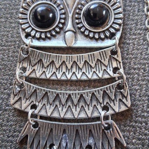 🦉Ugle metallsmykke av hengslet metall, komplett med fasettslipte glassøyne i svart og langt halskjede!