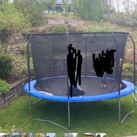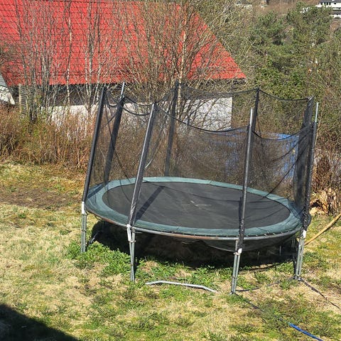 Godt brukt, oval trampoline gis bort. Funksjonell men kan trenge nye fester til nettet. Selve trampolinen fungerer som den skal.