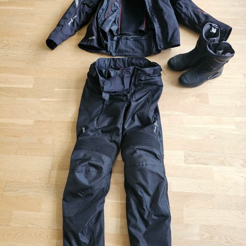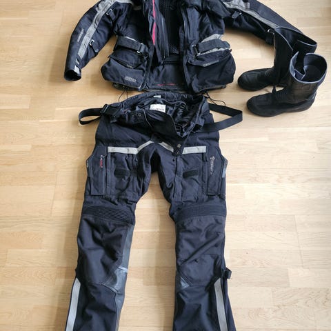 Lite brukt mc kjøreklær, sette med svart jakke er bare brukt ein kjøretur, jakke str D3XL. Bokse str 3XL/58. Sette med gul jakke er brukt litt mer, str jakke M og str bokse str XL/54. Pris på svart sett er 2400 og pris på sett med gul jakke er 1200.