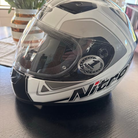 Airoh integralhjelm i flerfarget design (hovedsakelig blå, rød og hvit). Hjelmen har klart visir og heldekkende utforming som gir beskyttelse rundt hele hodet og haken. Innvendig polstring og kinnputer gir støtte og komfort. Egnet som motorsykkelhjelm eller til annen motorisert kjøring der integralhjelm er påkrevd.
